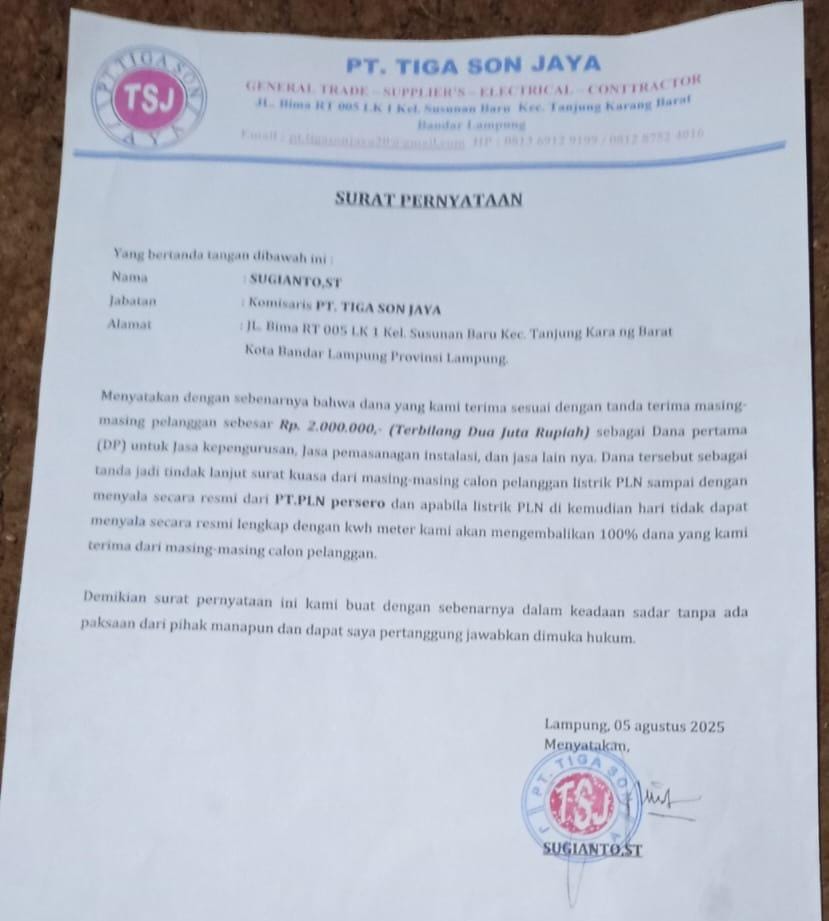 Informasi yang diterima Media Vibrasi News tv, menyebutkan bahwa sekitar 30 kepala keluarga telah menyetorkan dana antara Rp2 juta hingga Rp4 juta per rumah kepada seseorang bernama Wagiran, yang disebut sebagai ketua kelompok dalam proses pemasangan KWh meter PLN tersebut. Wagiran diduga kemudian menyalurkan dana tersebut kepada pihak ketiga, yakni PT Tiga Soon Jaya, yang beralamat di Bandar Lampung.